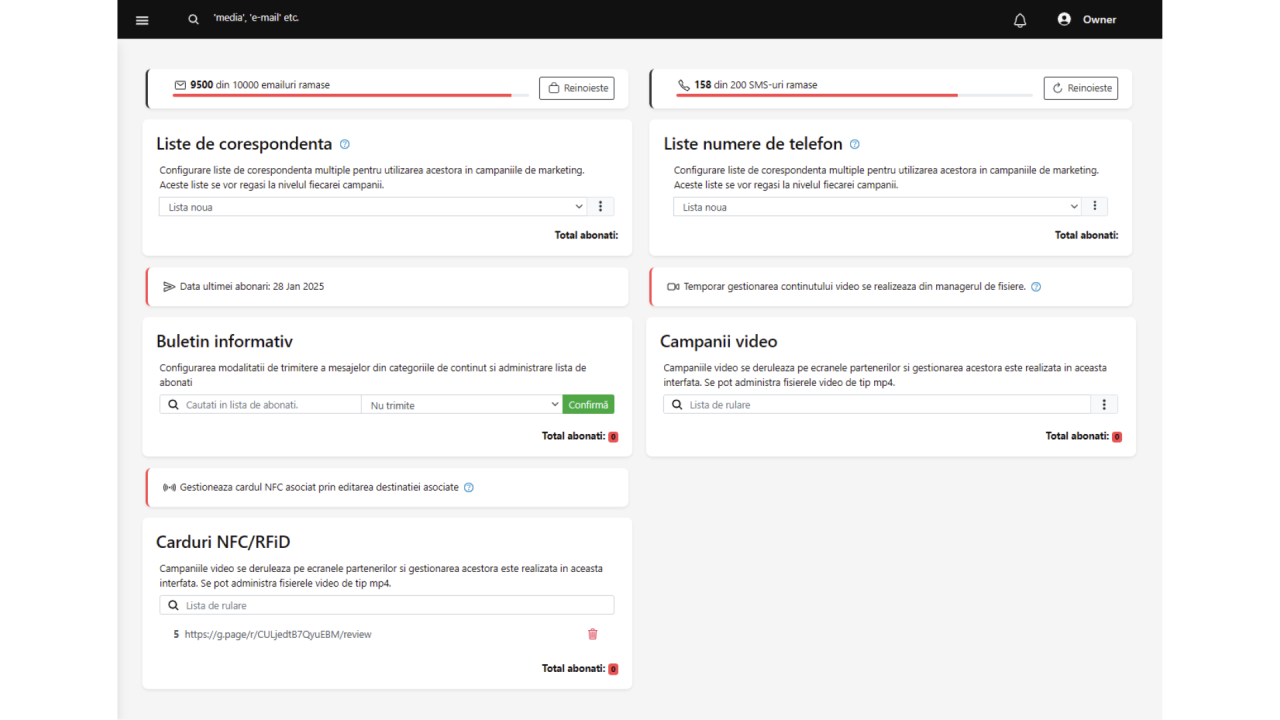 - ✔ Email & SMS marketing: cu liste ușor de importat și abonamente flexibile.